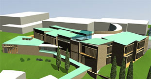 Die Schule besteht aus einem 2-geschossigen kompakten und gerundeten Baukörper mit Klassenzimmern, Lehrerzimmer, Bibliothek und Laboratorien.